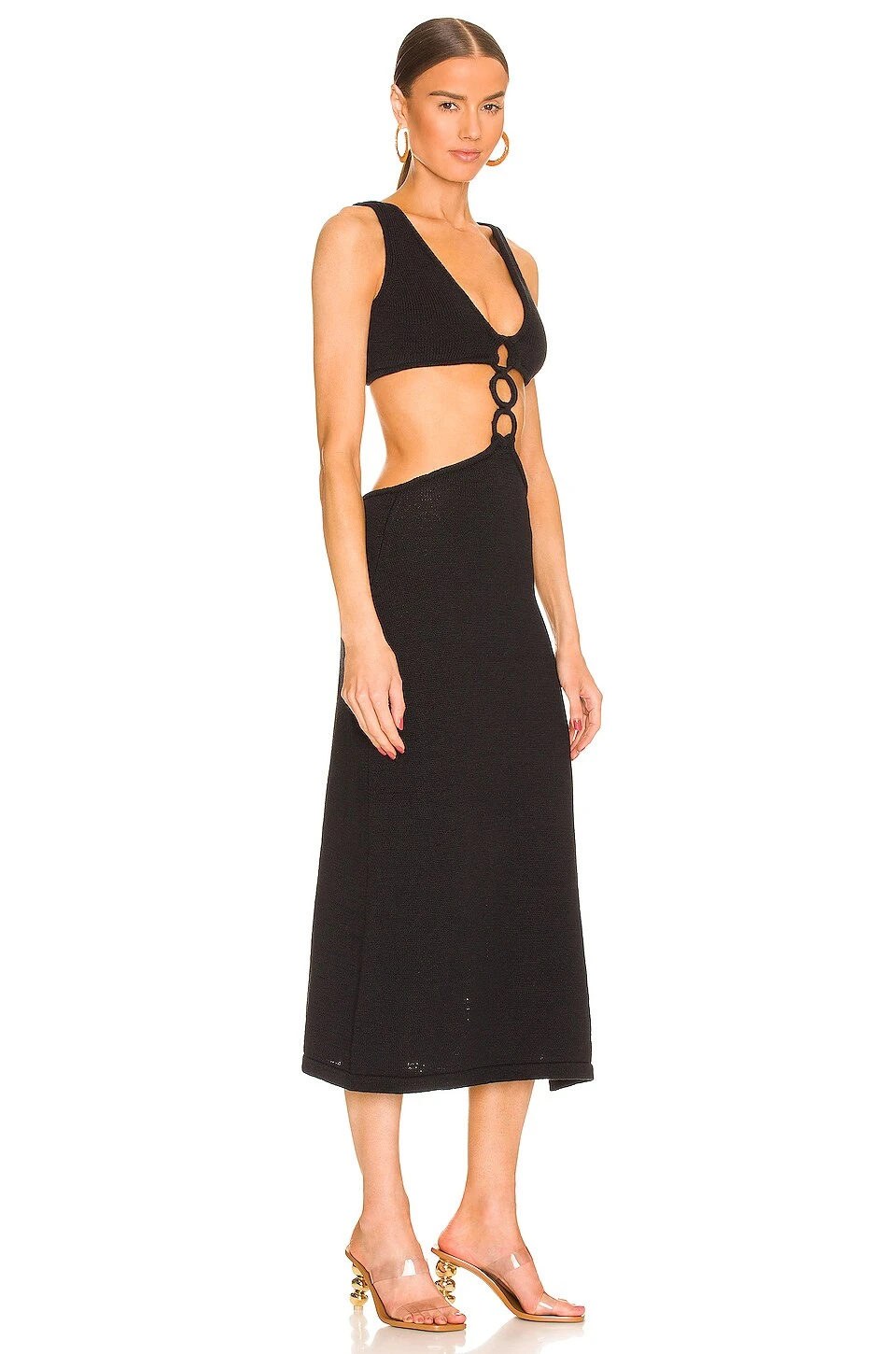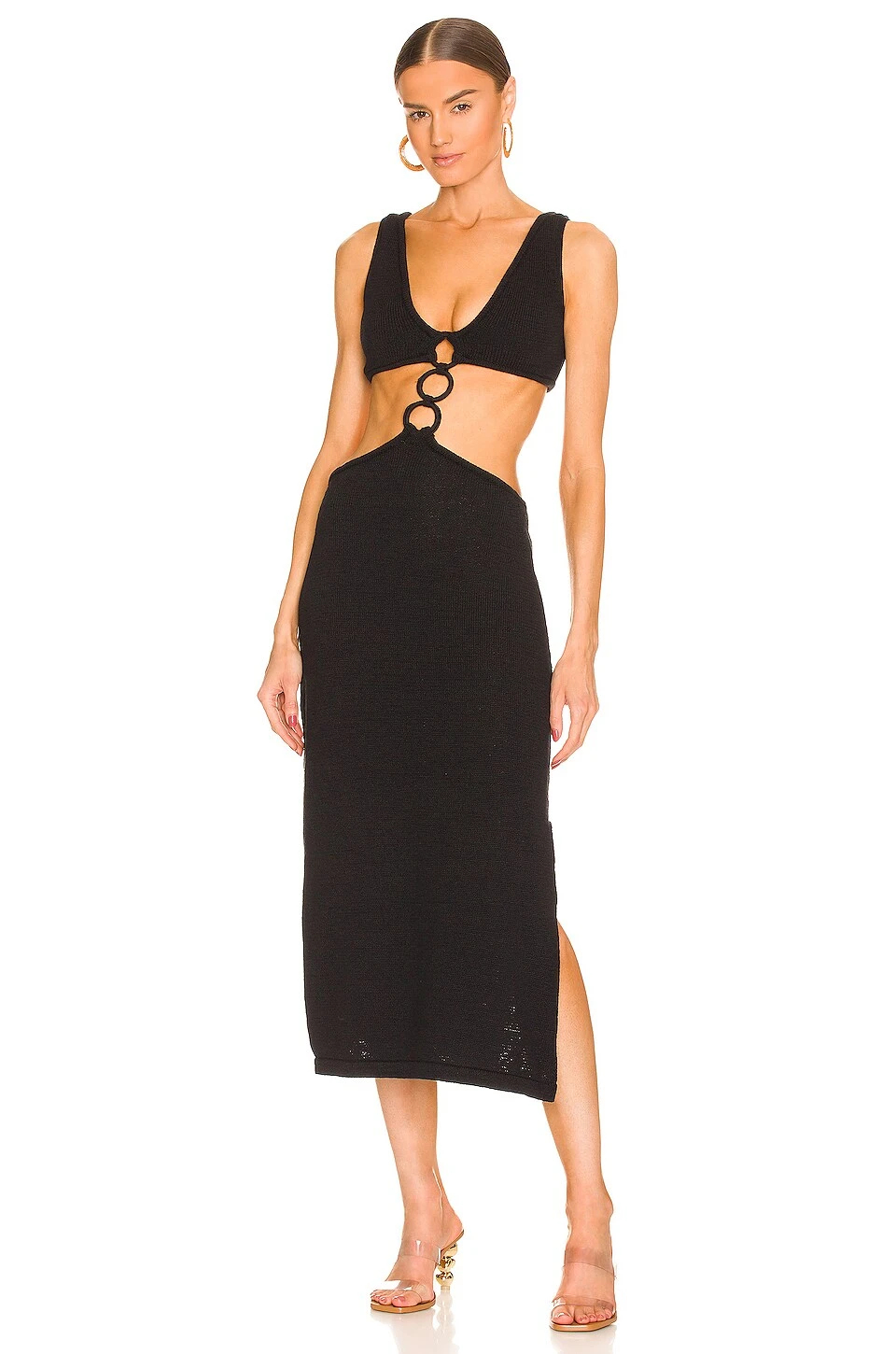 77% coton, 23% polyester. Fabriqué en Chine. Lavage à la main. Non doublé. À enfiler. Knit covered ring accents at center cut-out design. Tape yarn knit fabric with side seam slit. Revolve Style N° CULG-WD107. Fournisseur Style N° KD2297YN.