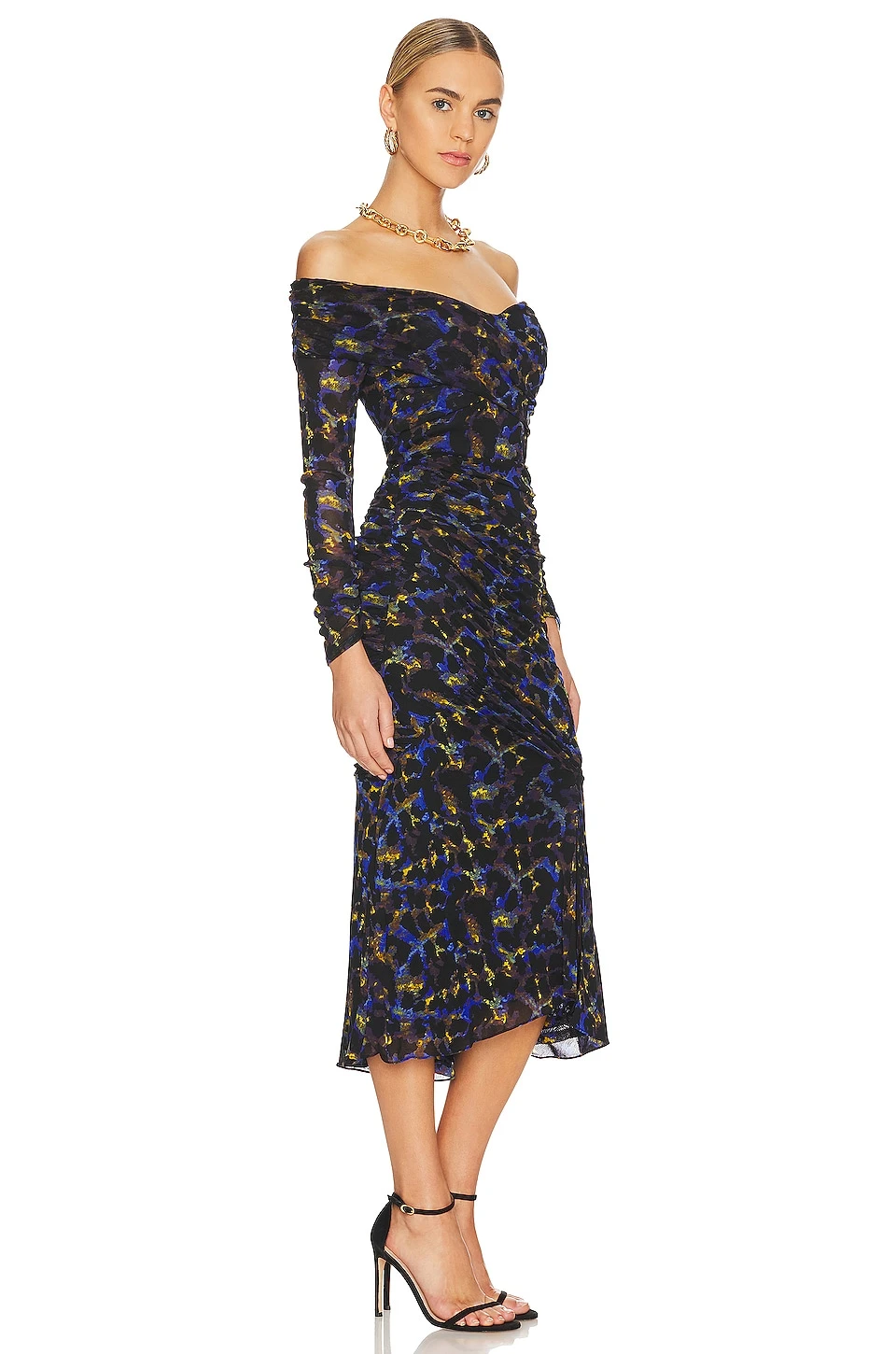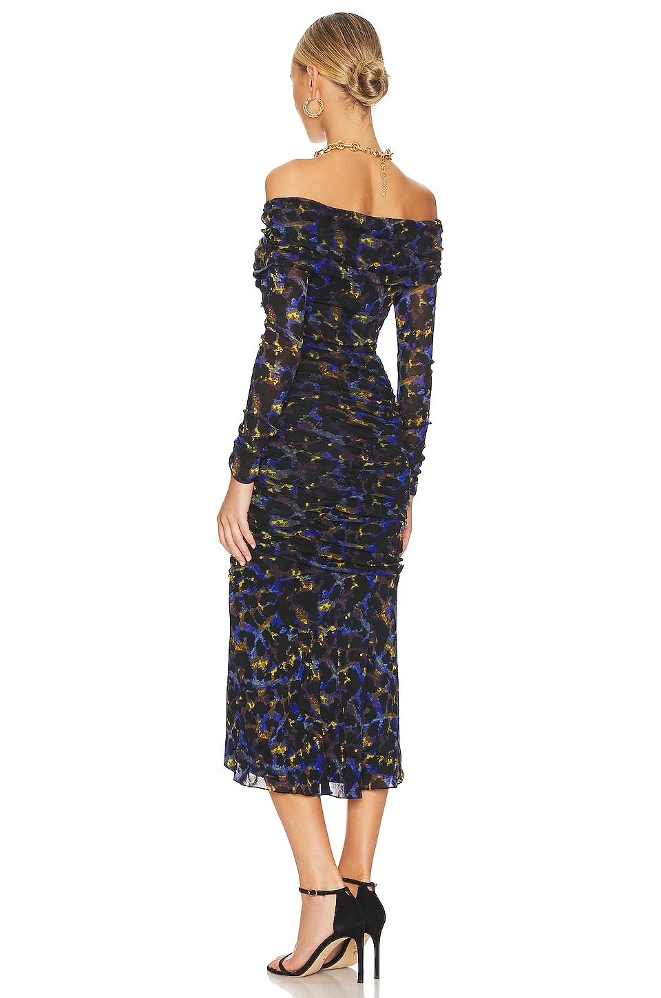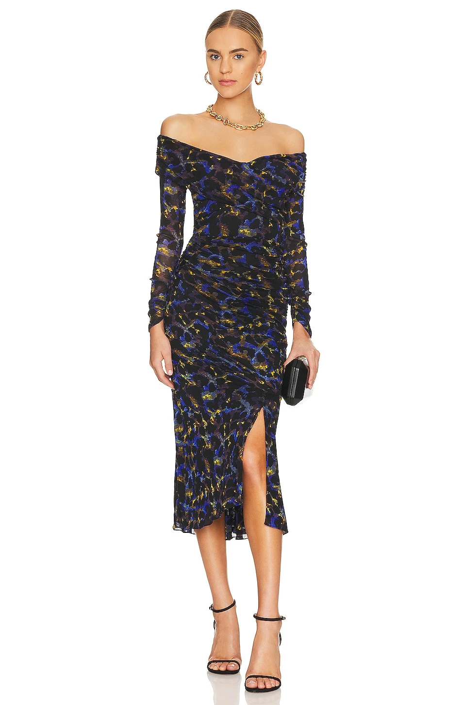 100% polyamide. Fabriqué en Chine. Lavage à sec uniquement. Entièrement doublé. À enfiler. Style épaules dénudées. Tissu mesh avec fronces et fente couture côté. Revolve Style N° DVF-WD465. Fournisseur Style N° DVFDL4Q037.
