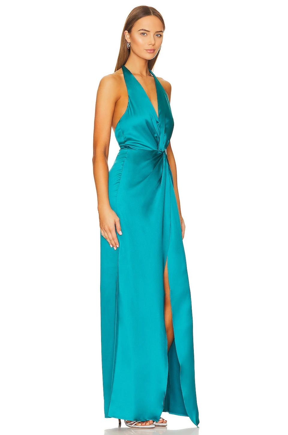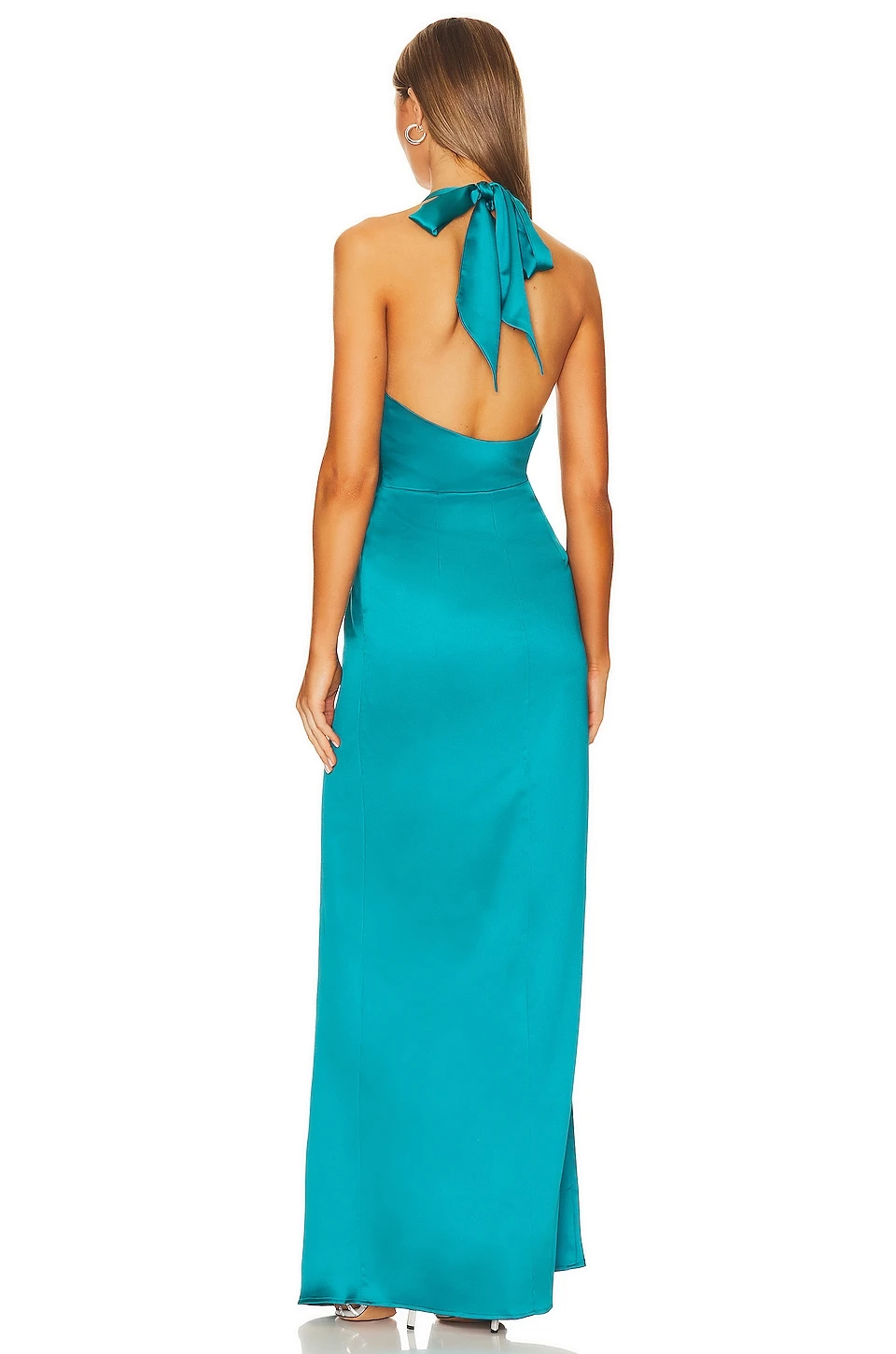 - Hidden side zipper and halterneck tie closure