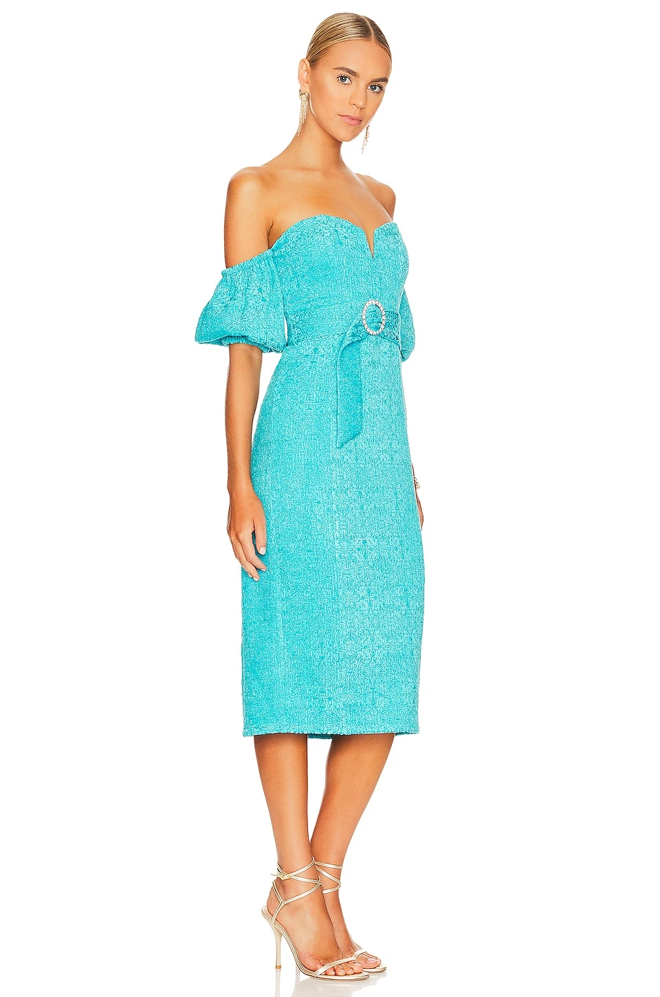- Off shoulder styling with puff sleeves and cinched cuffs