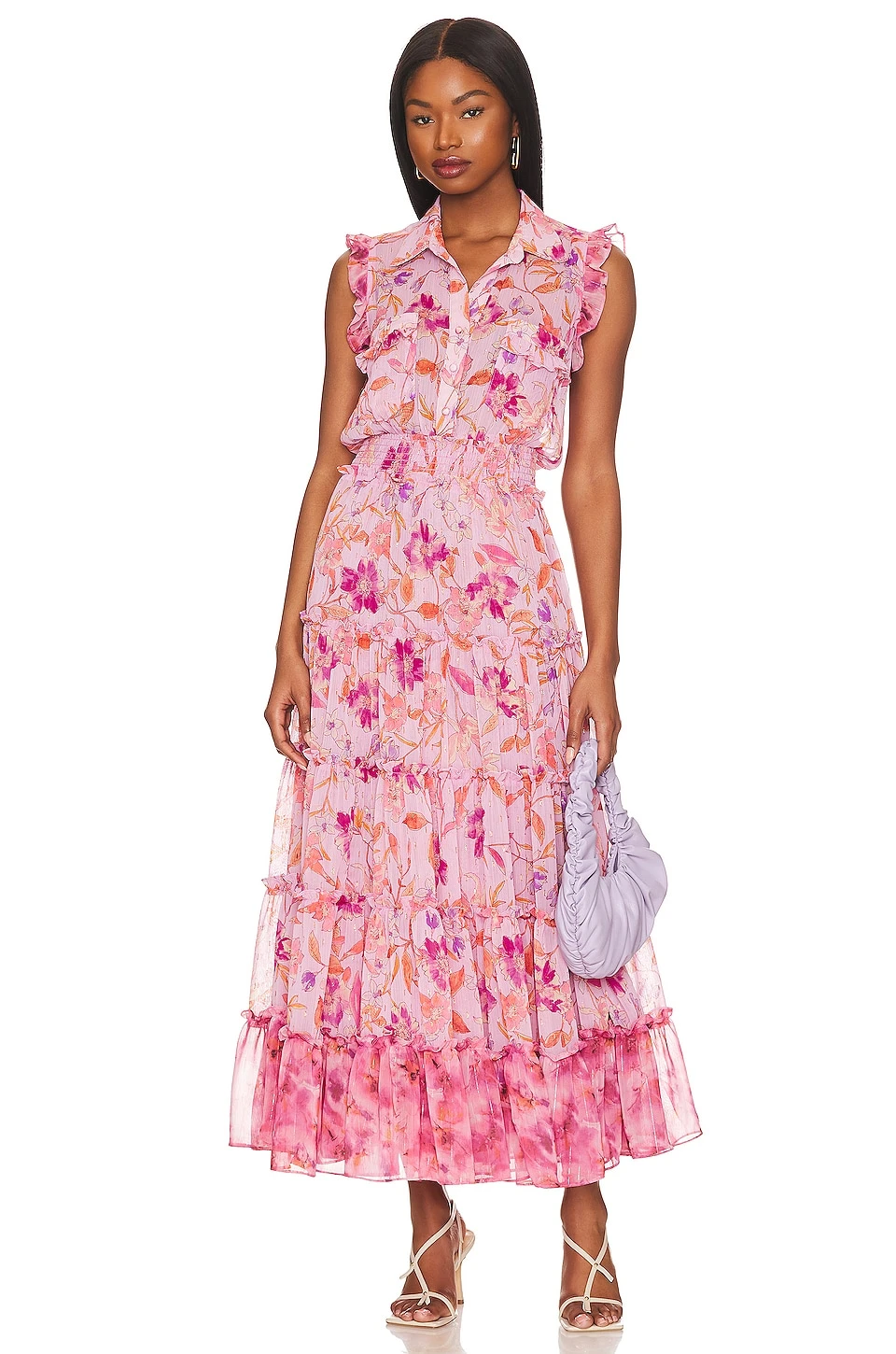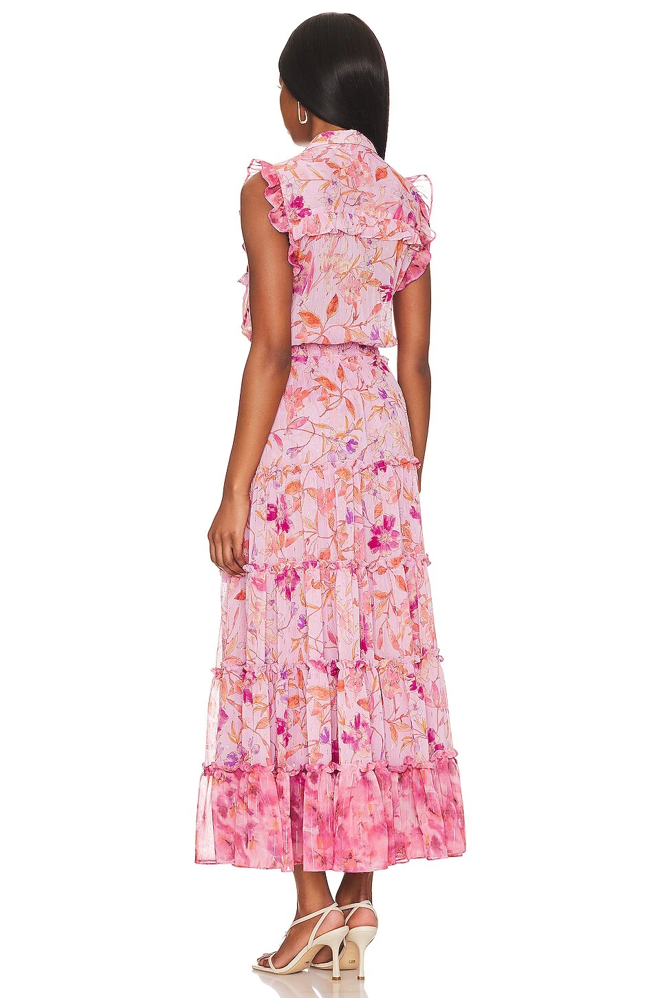 - Chiffon fabric with subtle metallic threading and ruffle detail throughout